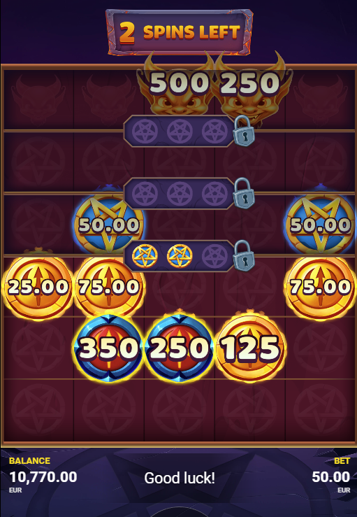 As the reels burn brighter, unlock the Free Spins feature and meet the sinister yet rewarding GOLDEN DEVIL. Once summoned, it collects coin and pentagram symbols beneath it, grants extra free spins, and unleashes win multipliers up to 10x. If that’s not enough to spark your luck, the mystical BLUE PENTAGRAM appears to collect symbols, trigger more spins, and eventually transform into a high-value BLUE COIN, keeping the reels alive with action.