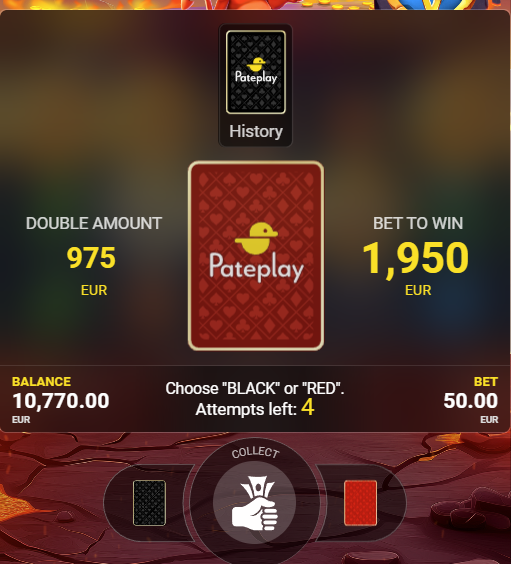 Your win can be DOUBLED. Choose between RED and BLACK to guess the color of the card; if the choice is correct, you win.